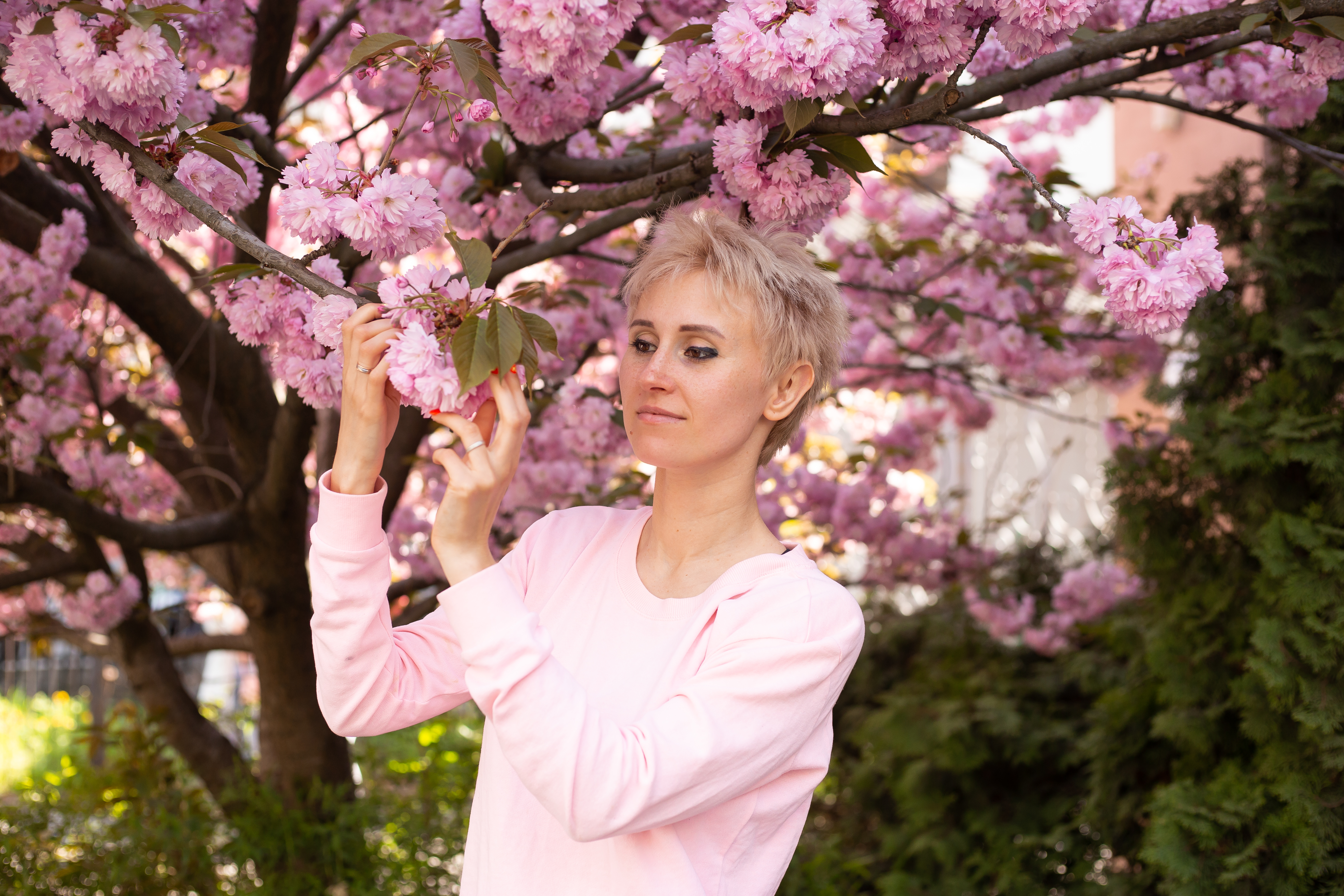 В период цветения цветочки густо набивают крону дерева, что придает сакуре необыкновенную пышность.
